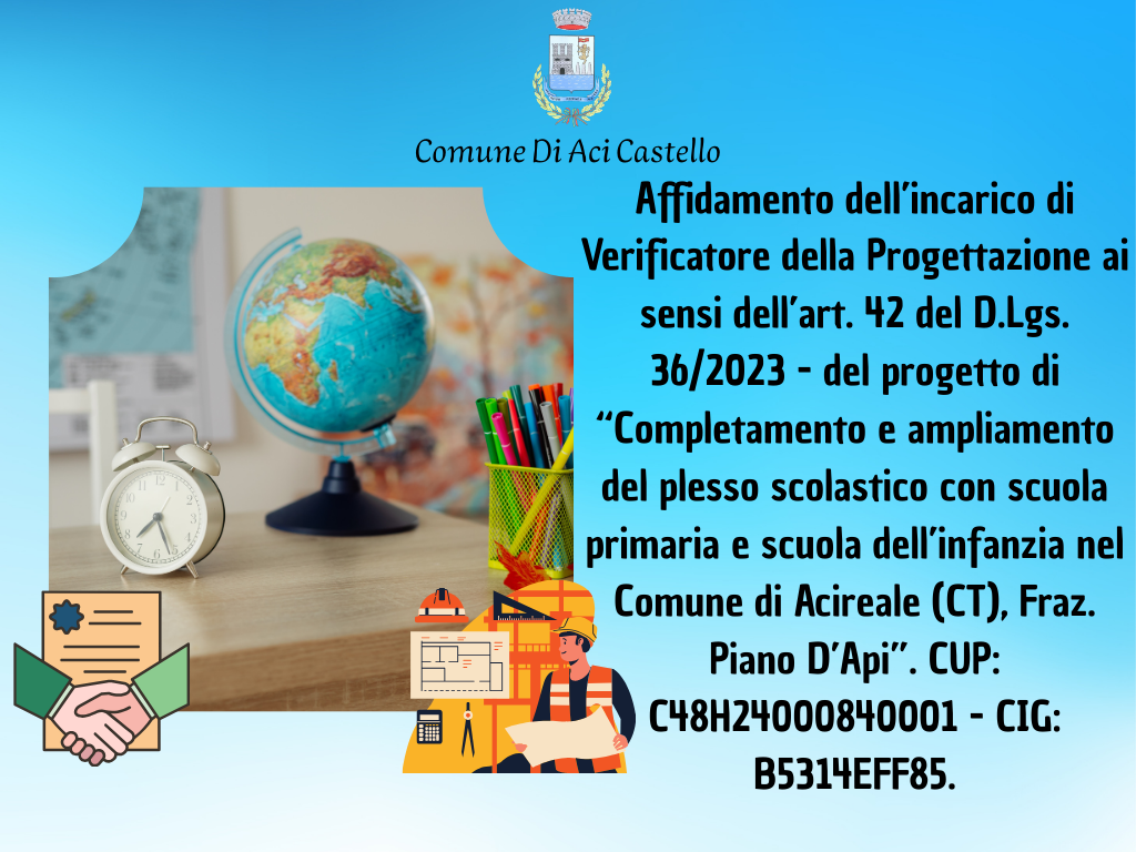 Affidamento dell’incarico di Verificatore della Progettazione ai sensi dell’art. 42 del D.Lgs. 36/2023 - del progetto di “Completamento e ampliamento del plesso scolastico con scuola primaria e scuola dell’infanzia nel Comune di Acireale (CT), Fraz. Piano D’Api”. CUP: C48H24000840001 - CIG: B5314EFF85.